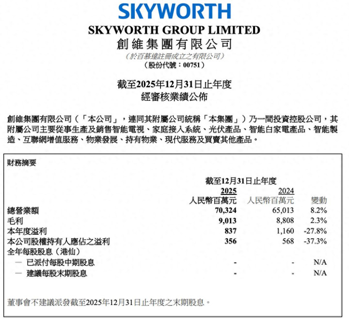 此前,创维集团披露了2025年财务报告。具体数据方面,2025年创维集团实现营收703.2亿元,同比增长8.17%;实现净利润3.56亿元,同比下滑37.32%。拉长周期来看,这已是创维集团连续第二年净利润下滑,上年净利润同比下滑46.87%。