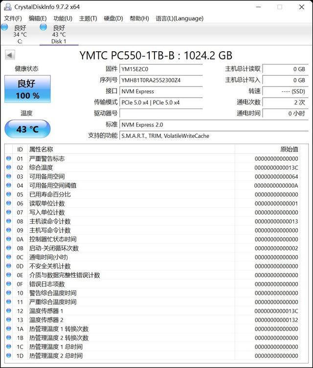 Crystal Disk Info信息显示,长江存储PC550 1TB采用1024.2GB足容量设计,支持PCIe5.0x4传输模式和NVMe2.0标准,以及S.M.A.R.T、TRIM和VolatileWriteCache功能,在25℃室温下闲时温度仅为43℃。