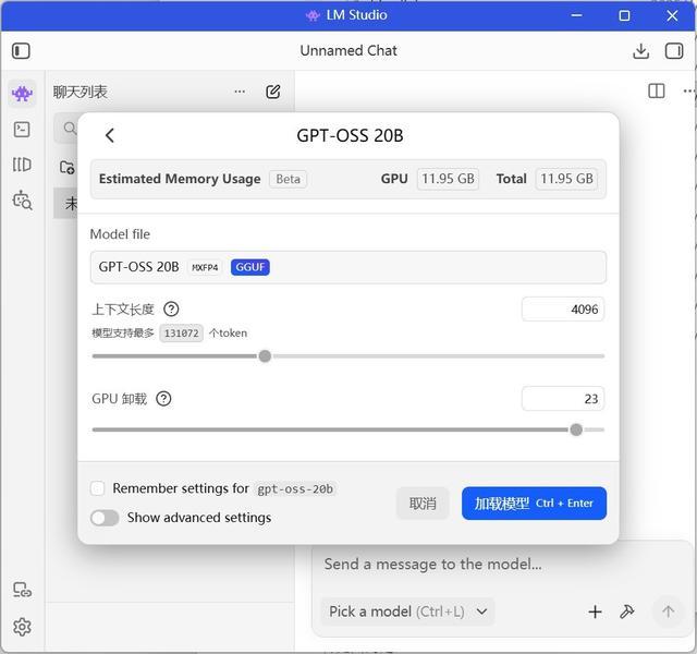 先看GPT-OSS 20B模型的加载,它的体积是11.95GB,使用默认配置加载用时为8.3秒。