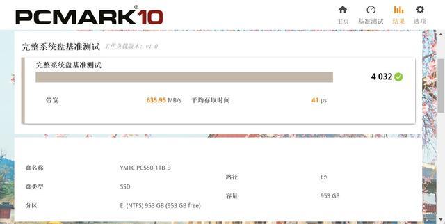 综合性能测试将模拟固态硬盘在实际应用、游戏加载场景,以及无任何辅助散热状态的满载发热表现。先看PCMARK10完整系统盘基准测试,它将固态硬盘模拟成系统盘,并以办公、视频播放等应用场景来对I/O性能进行评估。经测试长江存储PC550 1TB成绩为4032分,带宽635.95MB/s,平均存储时间41μs。