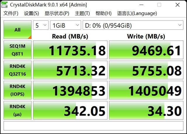 Crystal Disk Mark测试结果显示,长江存储PC550 1TB最高顺序读取速度达到了11735.18MB/s,比10500MB/s标称高出1200MB/s以上,顺序写入速度达到了9469.61MB/s;4K随机读写速度达到了1395K IOPS和1405K IOPS,均超过1300K IOPS的标称值,这基本是旗舰级PCIe4.0固态硬盘的随机性能了。