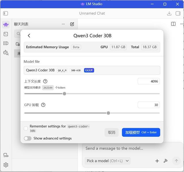 最后看千问3 Coder 30B模型的加载,它的体积是18.37GB,使用默认配置加载用时仅为10.6秒。