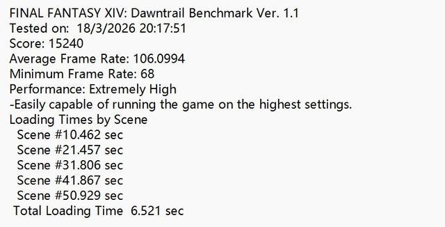 游戏在启动和场景转换的过程中,要加载大量的贴图、模型文件,这非常考验固态硬盘的性能。我们先看《最终幻想14:曦光旅路》的Benchmark,它能记录所有测试场景的载入时间。在3840x2160分辨率和最高画质下,长江存储PC550 1TB加载所有场景时间仅为6.521秒,可大幅缩短游戏的加载时间,降低玩家跑图时模型、贴图等素材实时加载的延迟。