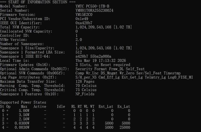 作为一款商用消费级的PCIe5.0产品,长江存储PC550最大的特色就是有着极佳能效,smartmontools信息显示,全速运行的PS0状态功率最高仅有5W,浅度睡眠PS3模式可低至3mW,深度睡眠PS4模式更是低至0.3mW,整体功耗设定和PCIe4.0的OEM硬盘非常非常接近,完美契合笔记本电脑的散热环境并提升了电池续航。