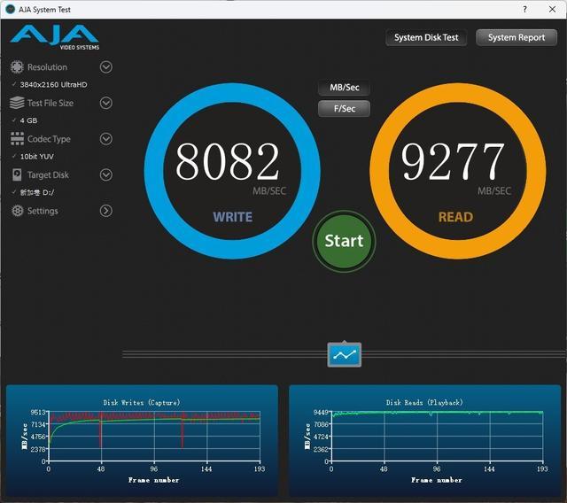 AJA System test是一款影视行业评估存储设备性能的测试软件,用户可以指定分辨率、色彩空间、位深、压缩类型和文件容器类型,模拟在硬盘上写入和读取视频文件的过程。软件中设定3840x2160 UltraHD分辨率、4GB文件大小和10bit YUV编码,实测长江存储PC550的读写速度达到了9277MB/s和8082MB/s,作为现代创作的生产力从容有余。
