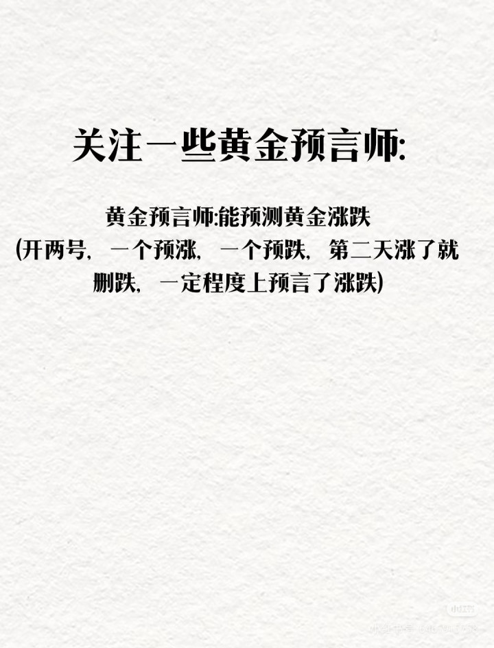 图片里调侃的“黄金预言师”开两个号、涨了删跌的玩法,看看就好,千万别当真。