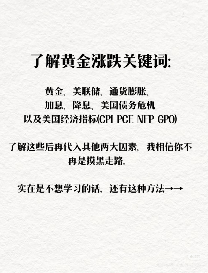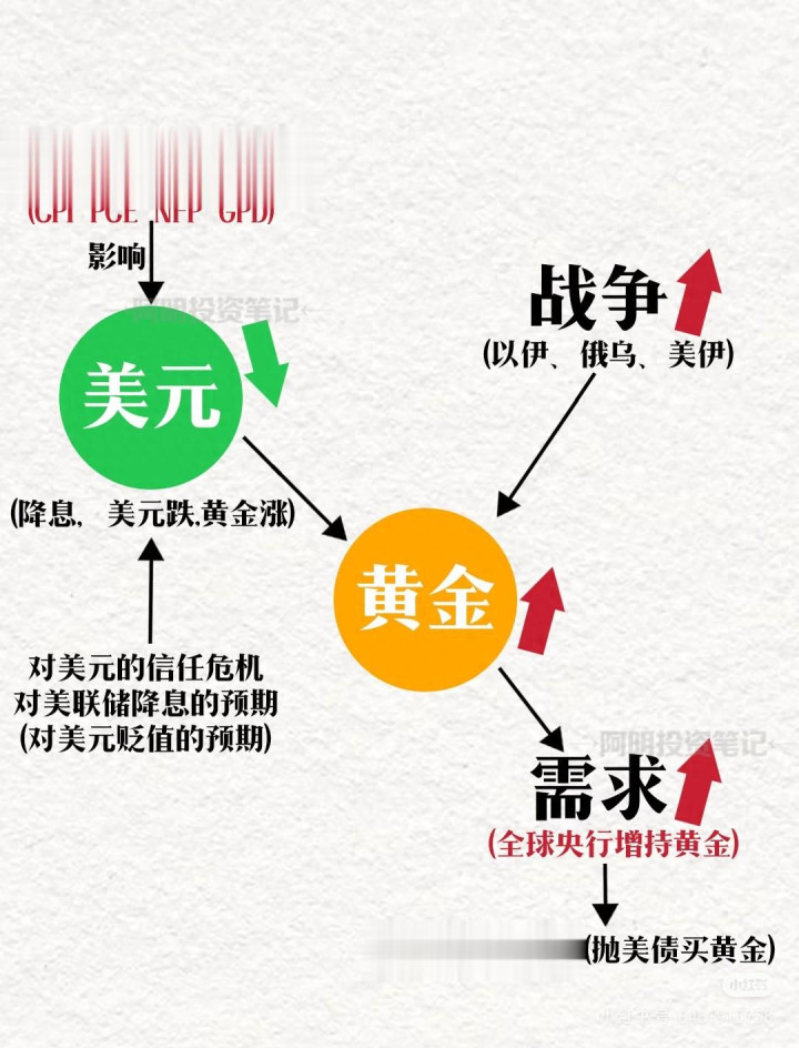 图片里的关键词写得很明白:CPI、PCE、NFP这些美国经济指标,一好,美联储就可能加息,美元走强,黄金这种无息资产就会承压;