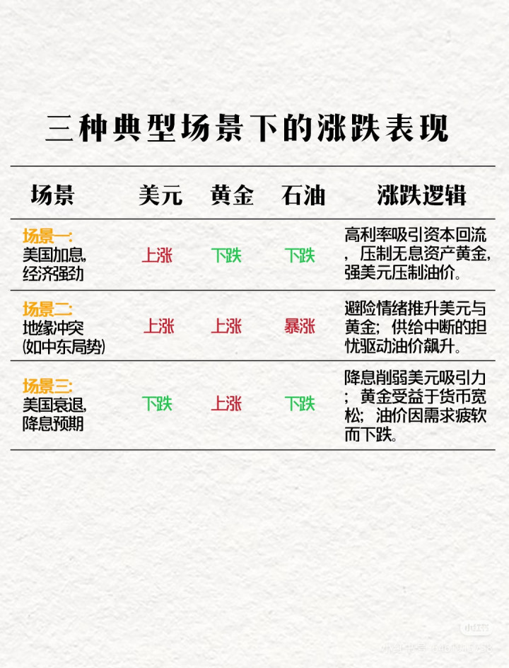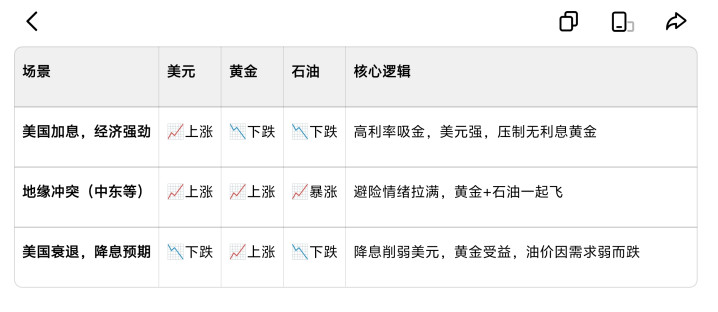就像表格里的场景二:地缘冲突爆发时,美元涨、黄金涨、石油暴涨,三者一起起飞,这是乱世最经典的走势。